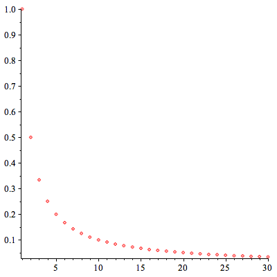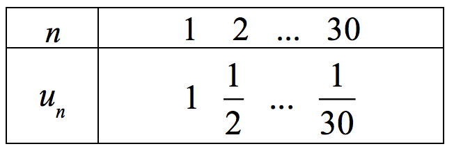 Bài toán 1. Ta biễu diển các phần tử của dãy ${a_n} = \frac{1}{n}$ trên hệ toạ độ. Lần lượt cho $n$ nhận các giá trị $1, 2,..,30$ ta được bảng gía trị và sự biểu diễn như sau