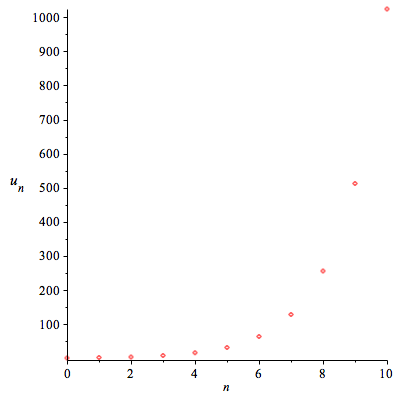 Bài toán 2. Bây giờ ta biểu diễn dãy ${u_n} = {2^n}$ trên hệ toạ độ. Ta lần lượt cho $n$ nhận các giá trị $ 1,2,...,10 $. Ta được sự biểu diễn sau đây
