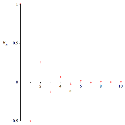 Bài toán 3. Ta thử biểu diễn dãy sau ${u_n} = {\left( {\frac{{ - 1}}{2}} \right)^n}$.