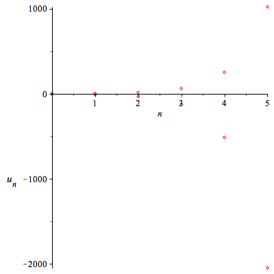 Ở hai bài toán trên, các phần tử của dãy $u_n$ luôn không âm. Do đó các dấu chấm đỏ