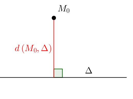 Ví dụ. Tính khoảng cách từ điểm ${M_0}\left( { - 1;2} \right)$ đến đường thẳng $\Delta :4x + 3y - 1 = 0$.