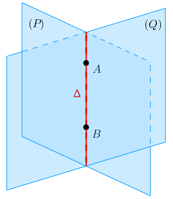 Giao tuyến. Nếu hai mặt phẳng $(P)$ và $(Q)$ cắt nhau theo đường thẳng $\Delta$ thì đường thẳng này được gọi là giao tuyến của $(P)$ và $(Q)$. Khi đó ta cũng viết $\Delta = \left( P \right) \cap \left( Q \right)$.