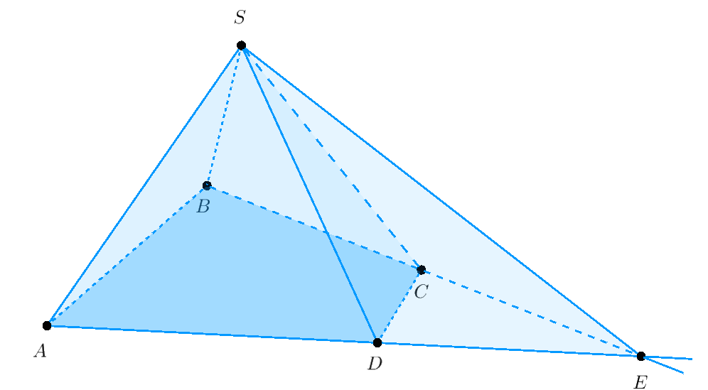 Giải. Trong mặt phẳng đáy $\left( {ABCD} \right)$ gọi $E = AD \cap BC.$ Ta có