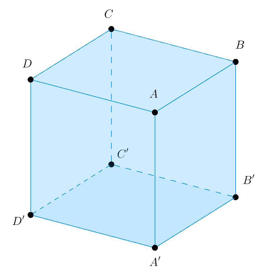 Ví dụ 1. Hãy xác định giao tuyến của hai mặt $\left( {ABCD} \right)$ và $\left( {ABB'A'} \right)$. Rõ ràng $A$ và $B$ là hai điểm chung phân biệt của hai mặt phẳng này. Như vậy $$\left( {ABCD} \right) \cap \left( {ABB'A'} \right) = AB.$$