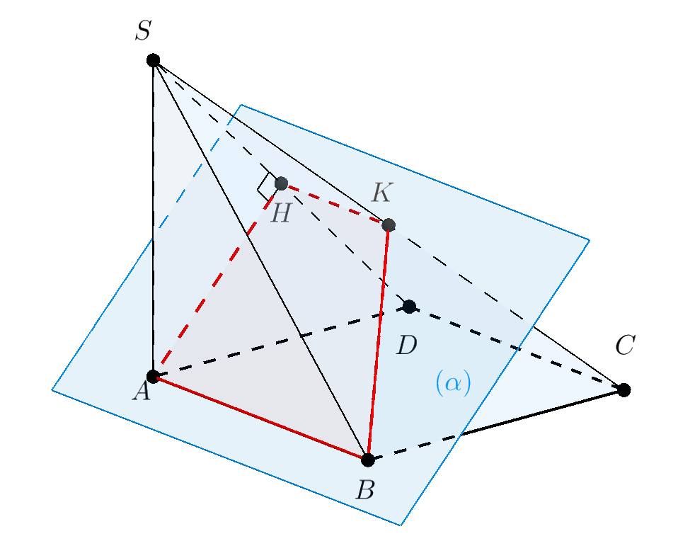 Bây giờ giả sử $\left( \alpha \right)$ cắt $SD$ tại $H$ Nếu ta chọn $H$ sao cho $SD \bot AH$ thì lúc đó, kết hợp với $SD \bot AB,$ ta có $SD \bot \left( {ABH} \right)$. Suy ra $\left( {SCD} \right) \bot \left( {ABH} \right).$