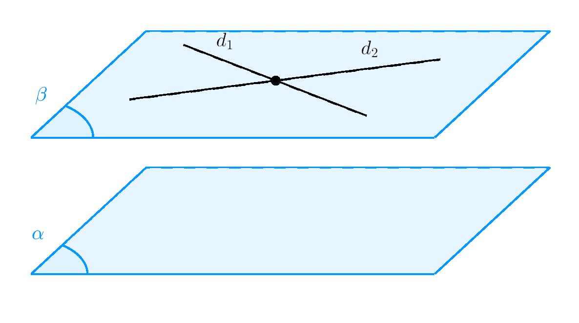 Mệnh đề 1. Nếu mặt phẳng $(\beta)$ chứa hai đường thẳng cắt nhau $d_1$ và $d_2$ cùng song song với mặt phẳng $(\alpha)$ thì $\left( \beta \right)//\left( \alpha \right)$.