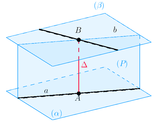 Bình luận. Tồn tại mặt phẳng $\left( \alpha \right)$ chứa $a$ và song song với $b$, mặt phẳng $\left( \beta \right)$ chứa $b$ và song song với $a$. Và hiển nhiên $\left( \alpha \right)\parallel \left( \beta \right)$. Các khoảng cách sau bằng nhau: