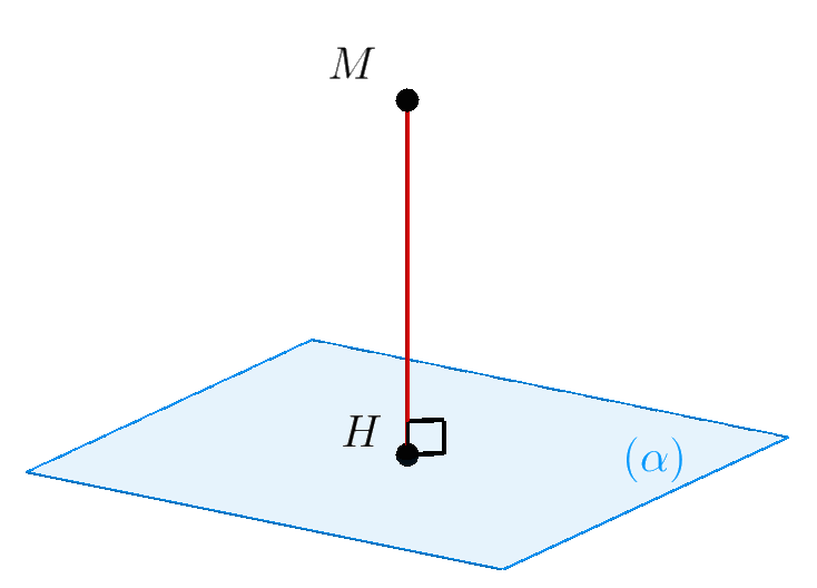 Định nghĩa. Khoảng cách từ điểm $M$ đến mặt phẳng $\left( \alpha \right)$ là khoảng cách giữa $M$ và hình chiếu vuông góc của nó lên $\left( \alpha \right)$, ký hiệu là $d\left( {M,\left( \alpha \right)} \right).$ $$d\left( {M,\left( \alpha \right)} \right) = MH.$$