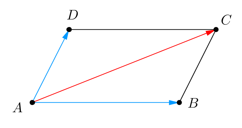 Quy tắc hình bình hành. Nếu $ABCD$ là hình bình hành thì $$\overrightarrow {AD} + \overrightarrow {AD} = \overrightarrow {AC}.$$ Quy tắc này cũng đúng nếu ta xuất phát từ đỉnh khác của hình bình hành.