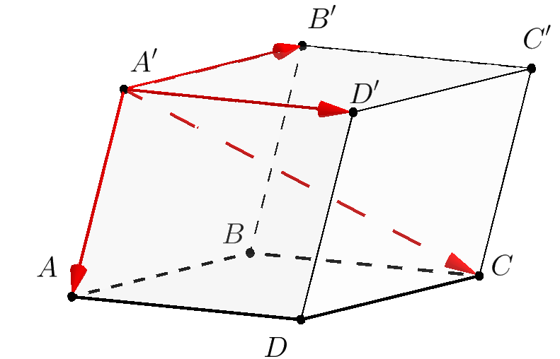 Quy tắc hình hộp. Cho hình hộp $ABCD.A'B'C'D'$. Các vector xuất phát từ đỉnh $A'$ thoả mãn đẳng thức $$\overrightarrow {A'A} + \overrightarrow {A'B'} + \overrightarrow {A'D'} = \overrightarrow {A'C} $$ Chú ý rằng quy tắc này cũng đúng nếu ta xuất phát từ một đỉnh khác của hình hộp.