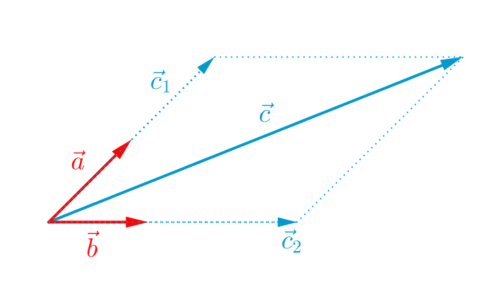 Định lý. Trong không gian cho 3 vector $\vec a,\vec b,\vec c,$ trong đó $\vec a,\vec b$ không cùng phương. Khi đó $\vec a,\vec b,\vec c$ đồng phẳng khi và chỉ khi tồn tại duy nhất một cặp số thực $m,n$ sao cho $$\vec c = m\vec a + n\vec b.$$Thật vậy, ta phân tích $\vec c = {\vec c_1} + {\vec c_2}$ theo quy tắc hình bình hành sao cho ${\vec c_1},{\vec c_2}$ lần lượt có phương song song với $\vec a,\vec b.$ Khi đó tồn tại các số $m,n$ sao cho ${\vec c_1} = m\vec a,{\text{ }}{\vec c_2} = n\vec b.$ Từ đây suy ra $\vec c = {\vec c_1} + {\vec c_2} = m\vec a + n\vec b.$