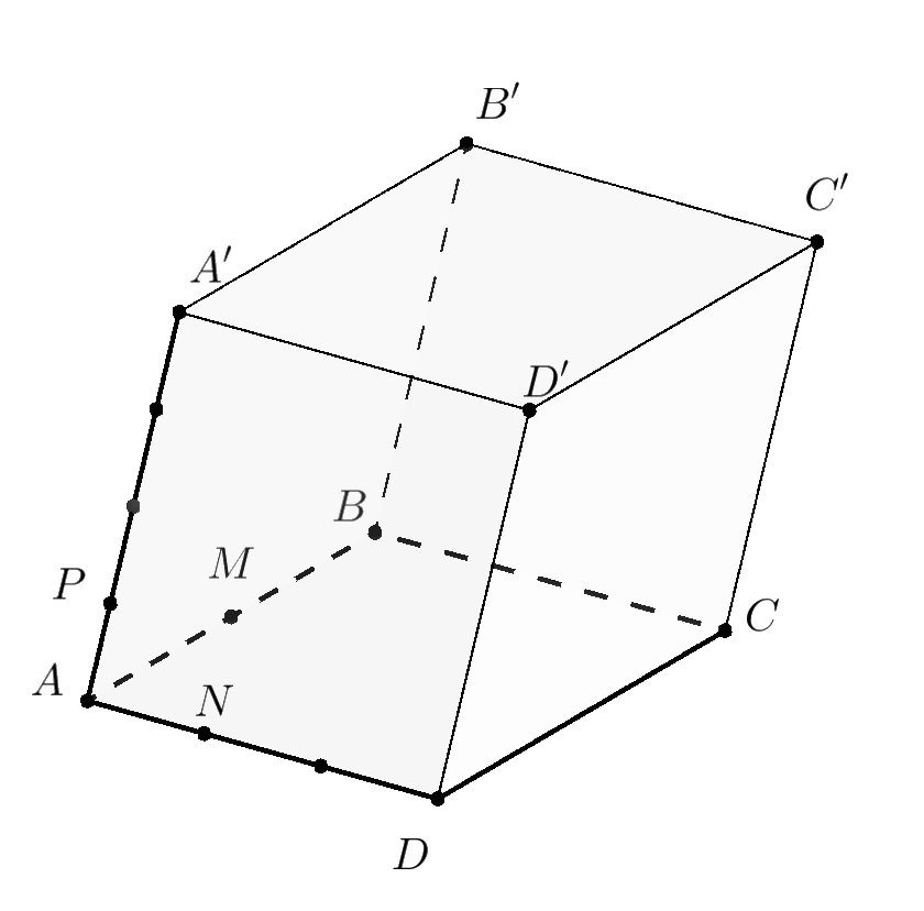 Ví dụ 1.Cho hình hộp $ABCD.A'B'C'D'$. Gọi $M,N,P$ lần lượt là các điểm thuộc các cạnh $AB, AD, AA'$ sao cho $AM = MB,AN = \frac{1}{2}ND,AP = \frac{1}{3}PA'.$ Khi đó