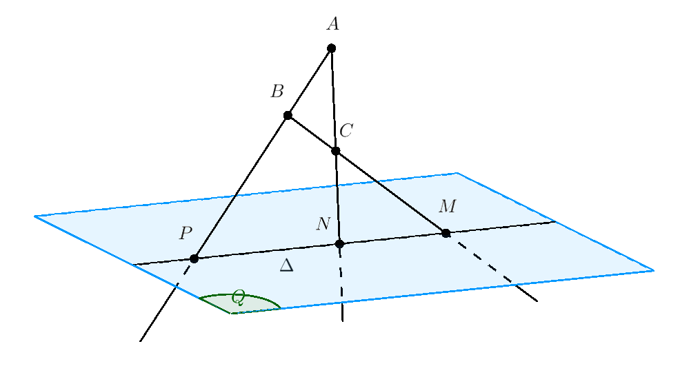 Ví dụ 1. Cho mặt phẳng $\left( Q \right)$ và ba điểm $A, B, C$ nằm ngoài $\left( Q \right)$. Giả sử các đường thẳng $BC,\,CA,\,AB$ cắt $\left( Q \right)$ lần lượt tại $M,N,P$ Chứng minh $M,N,P$ thẳng hàng.