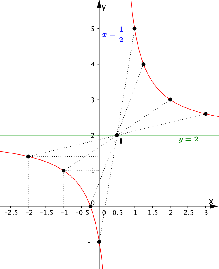 $ \bullet $ Tâm đối xứng: Giao điểm $I\left( {\frac{1}{2};2} \right)$ của hai tiệm cận là tâm đối xứng.