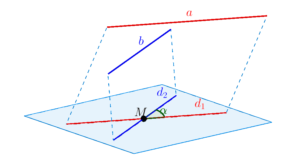 $ \bullet $ Khi đó ta định nghĩa góc hợp bởi giữa hai đường thẳng $d_1$ và $d_2$ là góc hợp bởi hai đường thẳng $a$ và $b$.
