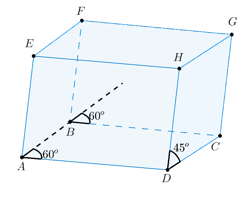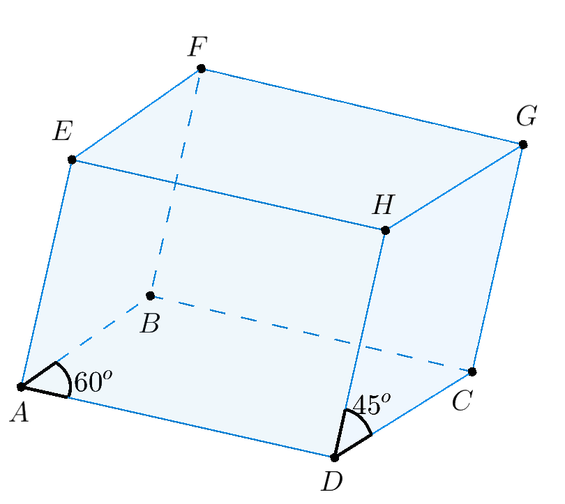 Ví dụ 1. Cho hình hộp $ABCD.EFGH$ có $\widehat {BAD} = {60^0},{\text{ }}\widehat {HDC} = {45^o},ABCD$ là hình thoi. Khi đó ta có