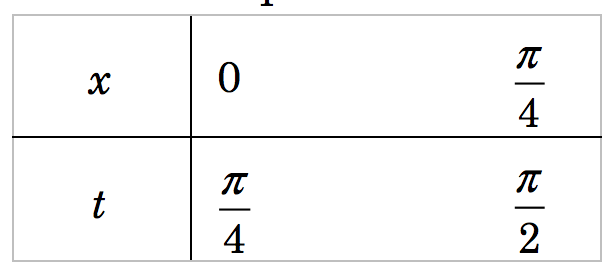 Suy ra $$I\,\,\, = \frac{1}{{\sqrt 2 }}\int\limits_0^{\frac{\pi }{2}} {\frac{{dt}}{{{\mathop{\rm sint}\nolimits} }} = \frac{1}{{\sqrt 2 }}\int\limits_0^{\frac{\pi }{2}} {\frac{{\sin tdt}}{{{{\sin }^2}t}} = } } \frac{1}{{\sqrt 2 }}\int\limits_0^{\frac{\pi }{2}} {\frac{{\sin tdt}}{{1 - {{\cos }^2}t}}} .$$ Đổi cận