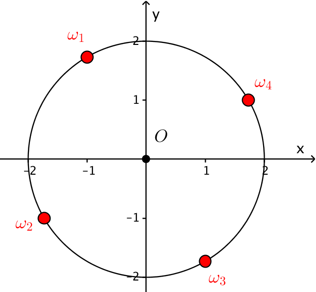 Các số phức ${\omega _1},{\omega _2},...,{\omega _n}$ được biểu diễn bởi $n$ điểm cách đều nhau trên đường tròn tâm $O$ bán kính là $\sqrt[n]{r}$.